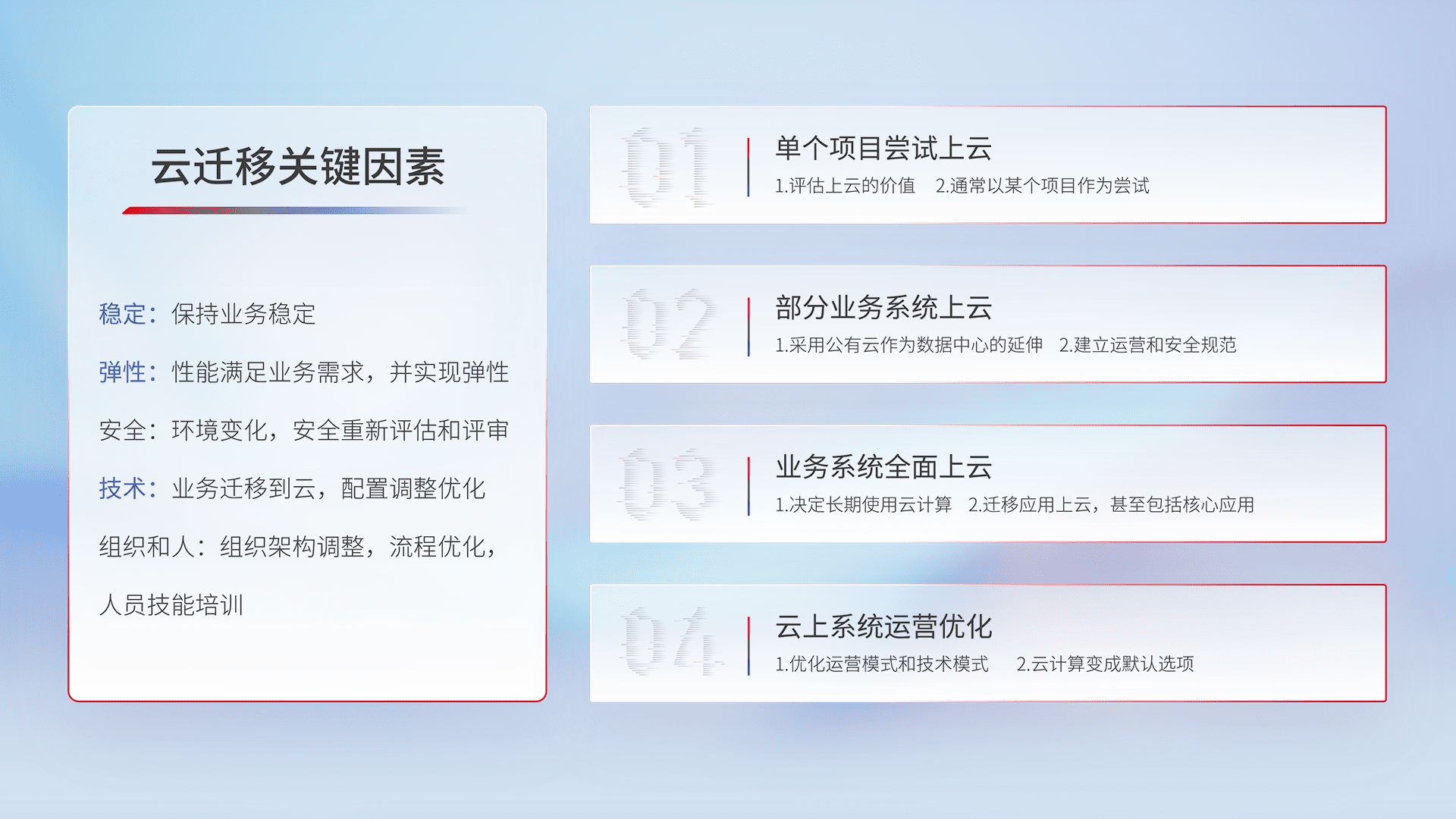 结合实际业务,,从规划设计、、云平台选型、、、云原生改造、、数据迁移、、、、集成交付,,,,迁移全过程为客户识别最佳上云路径,,,,做好风险识别管理,,,设计网络架构、、、身份权限、、安全审计合规、、操作审计、、、日志审计、、、监控告警策略、、、多站点容灾设计等,,,,对云上基础设施进行整体规划,,提升IT治理水平,,,以满足弹性、、高可用、、、、高性能的需求。。。