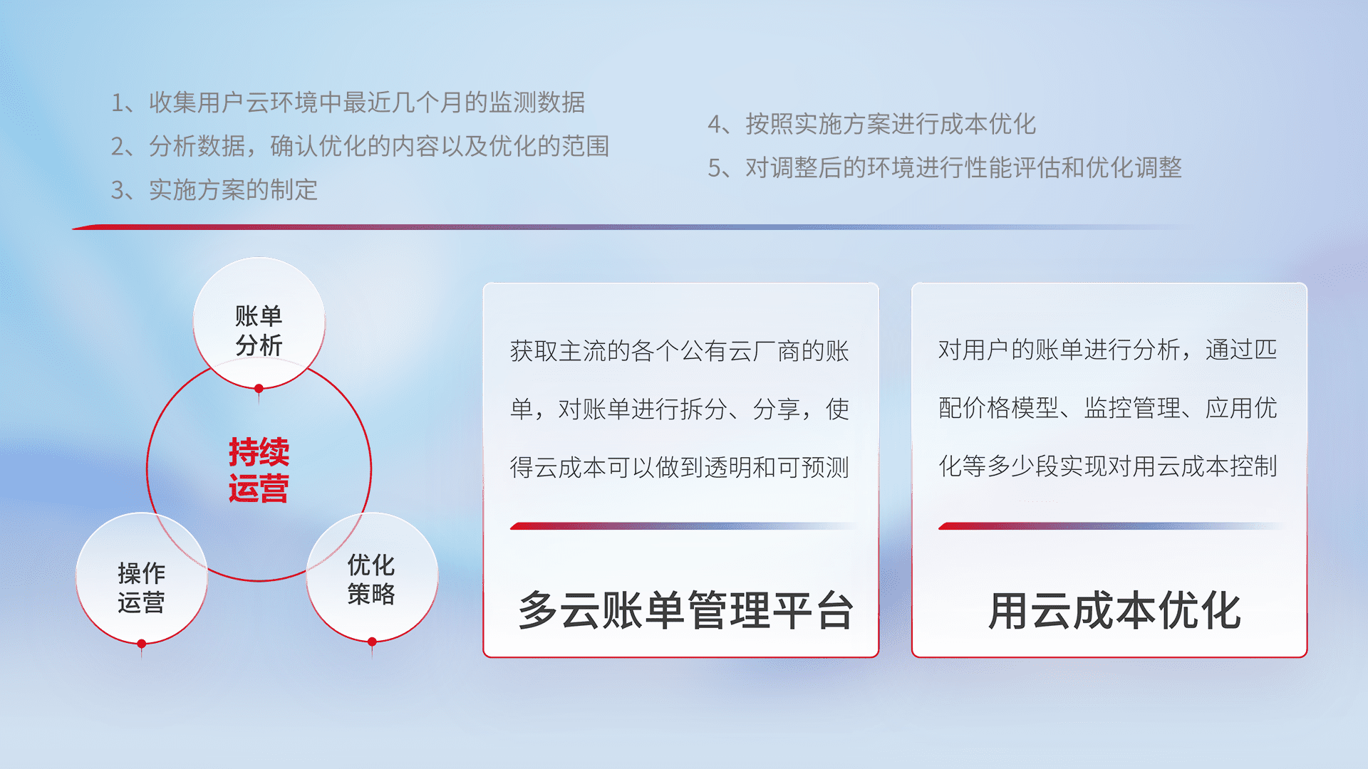 通过多云纳管,,,以统一的资源数据模型把客户的云资源进行抽象和封装,,,,进而实现对多云资源的统一操作,,保障云资源管理的可靠性、、稳定性与可用性。。量身定制化运维内容,,配置、、、、开发运维、、补丁管理、、备份、、、、监控、、、认证和访问管理、、审计和日常巡检等,,,保障在用云过程中的可靠度,,稳定度以及高可用率。。